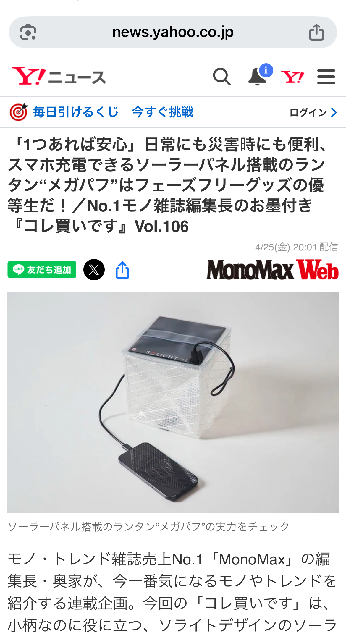 ソーラーモバイルでバッテリーに充電でき、夜の夜の灯りを確保できる MEGAPUFFを防災用品として1台用意しておけば、緊急災害時にスマホの電池が切れて情報難民になる心配もなくなります。