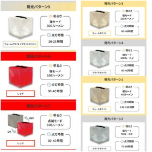 電源スイッチを短押しするごとに昼光色90㏐、温白色160㏐、昼光色160㏐、白昼色300㏐、赤色160㏐、赤色フラッシュ160㏐の順で切り替わり、もう一度押すと電源が切れます。